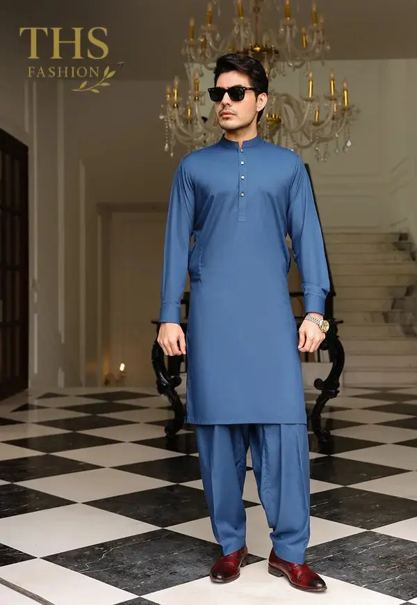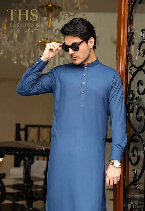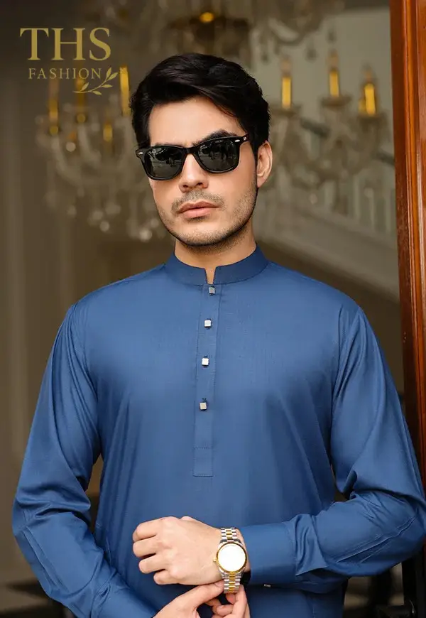 Step out in striking style with this Premium Dobby Blue Shalwar Kameez Set. The rich solid blue color offers a sophisticated look, perfect for evening events or day-to-day elegance.