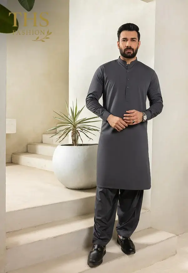 Serene and composed, pebble gray defines quiet refinement. This refined ensemble from This Fashion is meticulously crafted for the modern man who commands attention with subtle strength. The solid dark gray Shalwar Kameez features a sharp, tailored silhouette and a classic band collar, perfectly bridging timeless tradition with effortless modern grace.