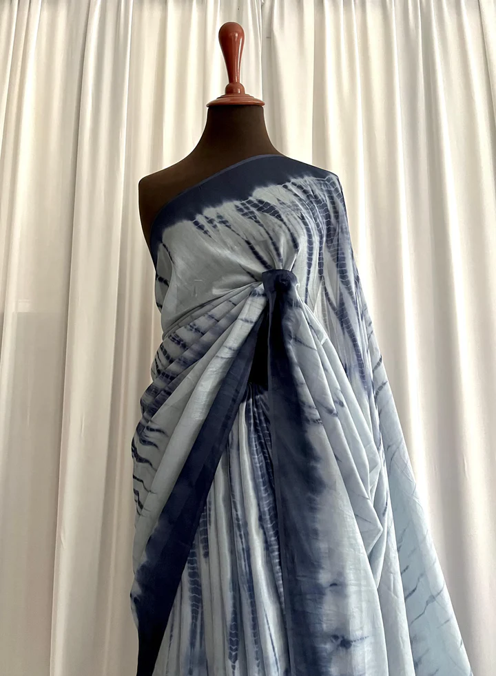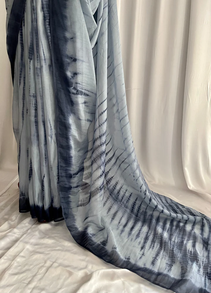 Saree: A breezy chiffon georgette saree in a striking palette of ice blue and navy-blue, crafted in a bold tie-and-dye technique. The abstract zebra-inspired pattern flows fluidly across the fabric, creating a play of shadow and light with every fold.